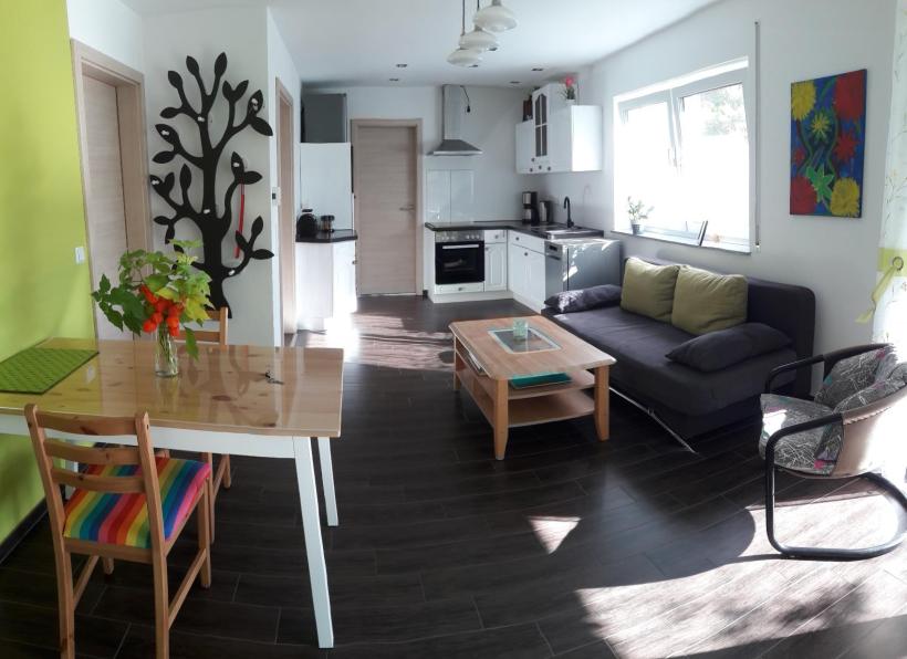 Der Wohnraum ist ausgestattet mit einer Couch, einem Wohnzimmertisch, Fernseher mit Sat-Anschluss, W-LAN, einem Esstisch, Stühlen und einer schönen Küche.